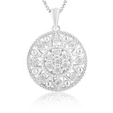 Brilliant cut diamonds interlace a sweet filigree pattern in this stunning pendant. With its generous size and unique style, you can wear this piece as a shimmering diamond statement and always impress.