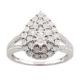 This sterling silver ring has all the glamour you'll ever need. Set with 30 brilliant cut diamonds this pear shaped ring glistens and shines effortlessly. With all those diamonds, you might not even notice the beautiful shaped band and its light reflecting pattern.