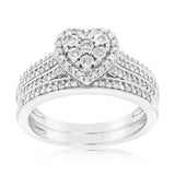 This 1/3 Carat Diamond 2 Ring Bridal Set in Sterling Silver is a treasure of pure beauty and shine, showcasing a perfect heart crafted with ⅓ carat diamonds with a matching ring pair. This sterling silver ring is made to last forever while producing a constant white shine, drawing the eye. Whether you choose to wear the set separately or together, you’ll be sure to radiate a hypnotising glow with this beautiful diamond set.