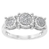 This 1/4 Carat Diamond Ring set in Sterling Silver is a must-have. The intricate three-stone design showcases the different facets and produces scintillating reflections that gleam and sparkle. All three of the brilliant-cut diamonds are in a bezel setting and supported by four prongs.