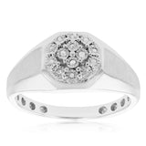 Stand out in this Sterling Silver Gents Ring with 14 Brilliant Cut Diamonds. This bold design features long, flat edges, and a striking diamond cluster at its centre. The bright sterling silver has been brushed for a masculine, classy finish.