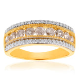 A divine dress ring crafted with Australian Diamonds set in 14ct Gold Plated Sterling Silver with 1 Carat Australian Diamonds. With striking and eye catching Champagne colour Diamonds everyone will want to copy your style. Please note that Australian Diamonds are naturally occurring and their colours range from champagne to cognac. No two Australian diamonds are exactly the same, making each one unique and special.