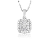 An alluring Sterling Silver Diamond Pendant on 46cm Chain with a superb, layered design. The centre holds a large brilliant cut diamond, which is encased in two beautiful halos of diamond. Every finely cut diamond offers a sparkle of its own. Silver is the sublime choice for the setting, with a shiny white colour to match and accentuate the dazzling diamond gemstones.