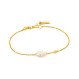 A pearl for everyday to protrude from the wrist, the Ania Haie Gold Plated Sterling Silver Pearl Bracelet features a baroque freshwater pearl on a delicate chain bracelet. Ania Haie brings every bit of elegance to the pieces she creates, and this stunning pearl bracelet is no exception. The eye immediately gets drawn into the asymmetrical shaped pearl that centres this masterpiece, sitting strong and proud, adjacent to a single cubic zirconia stone that beams at the touch of light. A stunning bracelet that can be worn on its own or accompanied by other styles to accentuate the look.