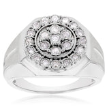This Sterling Silver Gents Ring with Brilliant Cut Diamonds makes a statement. Set with a cluster of expertly cut diamonds, this silver ring is full of glimmer. The classy look is balanced with a strong design and bold facet-work.