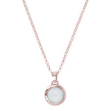This Bronzallure Rose Gold Plated Faceted Aqua Chalcedony Necklace 45.7cm has a tranquil, soft appearance. Light tones of Bronzallure rose gold match with a subtle yet beautiful aqua chalcedony, cut neatly for extra shine. The stone and bezel pendant sits on a rose gold plated necklace with a belcher design.