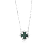Clover Malachite And White Cubic Zirconia Pendant on 45cm Chain in Sterling Silver Rhodium Plated