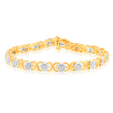 Impress everyone with this special Gold Plated Sterling Silver ¼ Carat Diamond Hugs and Kisses Bracelet. Made from luxurious gold plated sterling silver the bracelet criss crosses over creating the hugs and kisses pattern. The brilliant cut diamonds sit perfectly between the crosses and sparkle when they hit the light. Treat yourself with this beauty or gift it to someone special in your life.