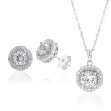 This set exudes elegance, the Sterling Silver Pendant and Earrings have been set with small white sapphire stones that surround an even larger sapphire centrepiece. The sterling silver features a beautiful floral pattern. This set is sure to impress and add a sparkle to your everyday.