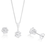 Make a statement with this Zirconia pendant and earring set. A simple and sparkling 6mm round Zirconia claw set pendant completed with a Sterling Silver chain and complimented by matching Zirconia earrings, the set is perfect for that special gift or for spoiling yourself.