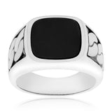 This masculine men's ring features a stunning sterling silver build that has a black enamel that commands respect. Along the sides is a weaving pattern that almost looks like steel chains wrapping around each other. If you’re looking for your first men’s ring or keen on adding another one to your collection this would be a great choice as it has a strong masculine style and premium materials.