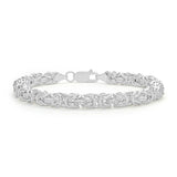 This unique bracelet is a must-have. Intertwining chic a byzanite pattern, the sterling silver bracelet is sure to make a statement wherever it is worn.