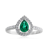 Elegant in design, this beautiful created Emerald and white Zirconia ring has a modern twist to the classic pear shaped ring. With a halo of sparkling white Zirconia to enhance the coloured centre feature, this stunning ring also has white Zirconia set half way down the shoulders. Crafter in Sterling Silver.