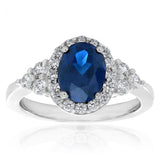 Surrounded by a halo of Zirconia, this classic centre of an oval Created Sapphire is enhanced by a triangle formation of three round Zirconia stones on the ring shoulders.
