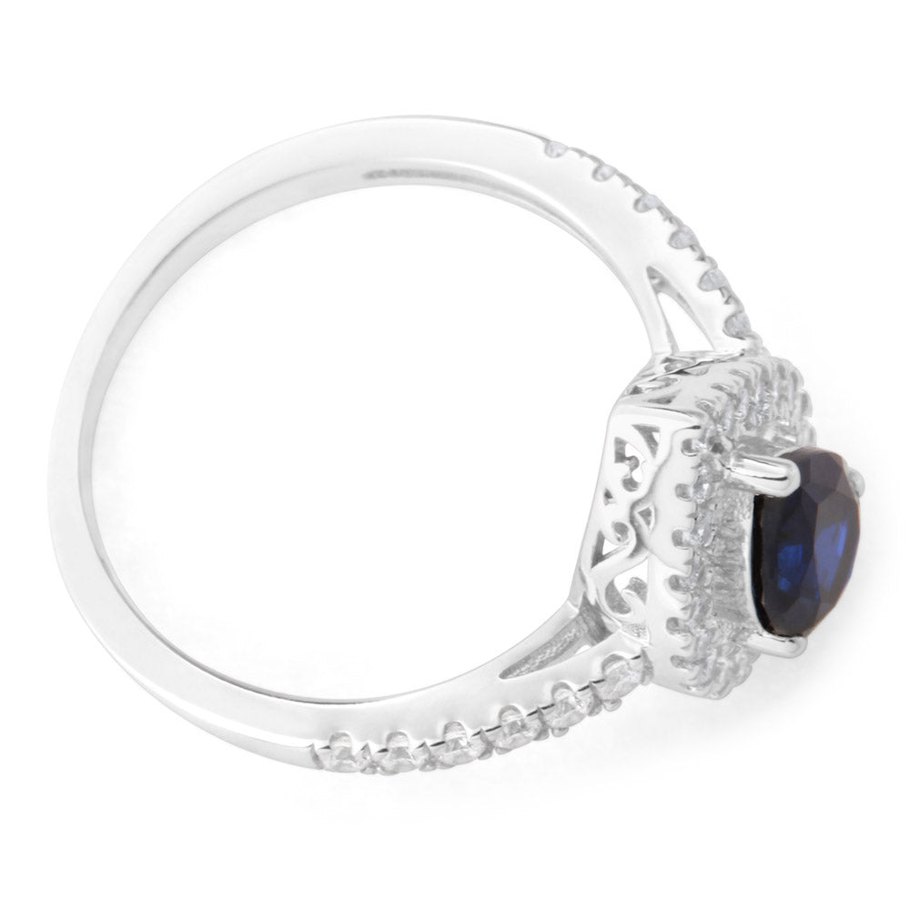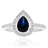 Elegant in design, this beautiful created Sapphire and white Zirconia ring has a modern twist to the classic pear shaped ring. With a halo of sparkling white Zirconia to enhance the coloured centre feature, this stunning ring also has white Zirconia set half way down the shoulders. Crafter in Sterling Silver.
