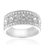 This sterling silver fancy ring features a stunning array of sparkly zirconia stones along the front side. The middle row is made up of bigger stones with the top and bottom rows being made up of smaller stones. This creates a stylish pattern with a beautiful shimmer. The luxurious sterling silver build means this ring will easily last a lifetime with the right amount of care.