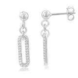Stay trendy with these Sterling Silver Cubic Zirconia On Open Rectangle Drop Earrings. Crafted in reflective sterling silver with a smooth finish and shiny lustre that is luxurious, these earrings are versatile for any occasion. Embellished with the sparkle of stunning stones, these earrings are sure to turn heads wherever you go. Complete with a push back clasp, they are comfortable for everyday wearing. Elevate a casual look, or upgrade a formal attire with a trendy pair of earrings that you will love.