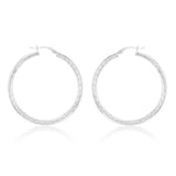 Step out in style Sterling Silver Diamond Cut 40mm Hoop Earrings. Silver hoop earrings are a must-have in any jewellery wardrobe and are the finishing touch to any look. You can wear them on their own or pair them with other silver jewellery for a curated look that is stylish and chic. The hoops feature a subtle twisting pattern that reflects wonderfully in the light and gives the piece an interesting look. The latch back clasp is comfortable to wear and is sturdy for all day wearing.
