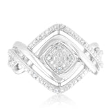 Elevate your elegance with this sterling silver diamond ring, boasting a captivating design of interwoven brilliance. Adorned with ten brilliant cut diamonds, this ring exudes a timeless charm and sophistication. Each diamond sparkles with exceptional brilliance, beautifully complementing the intricate interlocking pattern of the sterling silver band. Perfect for adding a touch of glamour to any ensemble, this ring is a testament to refined craftsmanship and enduring style.