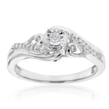 Beautiful sterling silver ring with swirls of 11 white diamonds & featuring 2 natural enhanced pink sapphires accented hearts.