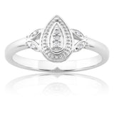 This Sterling Silver Marquise Shaped Diamond Ring is crafted with beautiful symmetry and pristine silver colour. Its pear-shaped centrepiece is set with three fiery diamonds, and accentuated by elegant marquise-like shoulders. The ring is presented in a subtle but graceful way, letting its design and dainty diamonds take centrestage.