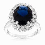 This Sterling Silver Oval Blue And White Zirconia Halo Ring is the epitome of luxury, boasting a rich blue zirconia gemstone. The halo design adds to its allure, showcasing an intricate, yet statement, layout of white zirconia stones. The ring band, crafted in sterling silver for durability, fits comfortably around the finger.