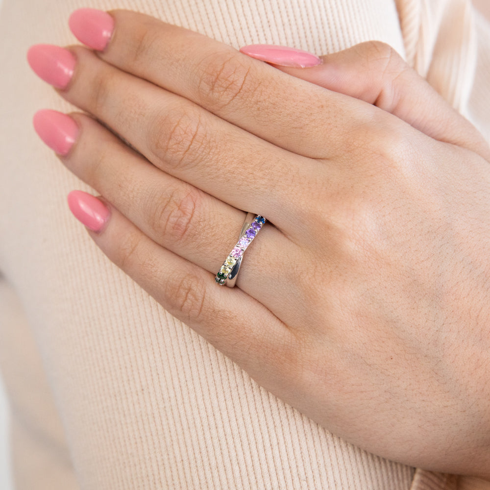 This beautiful Crossover ring with Multicoloured Cubic Zirconia is created with Sterling Silver. Trendy and elegant this ring can be matched with any outfit and accessory.