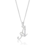 This necklace features a stunning rhodium-plated sterling silver chain and pendant that has been formed into the letter “A” in a cursive font and then set with beautiful zirconia stones that add a brilliant sparkle. The rhodium plating gives this piece an extra shimmer that gives this piece a luxurious flair. A perfect treat for you or someone special in your life with a name that begins with “A”.