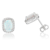 Embrace vintage glamour with these stunning Sterling Silver Rhodium Plated Rectangle Synthetic Opal and White CZ Halo Stud Earrings. The centre stone features a lovely opal with reflections of blue, green and white that are only achieved from the unique finish of an opal. The halo setting features glittering cubic zirconia stones framing the outside of the piece giving your look a vintage touch and wonderful sparkle. A classic rectangle shape is versatile and gives a contemporary twist on an otherwise classic design.