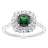 This Sterling Silver Rhodium Plated Green And White Cubic Zirconia Cushion Ring makes a statement with its rich colour and dazzling sparkle. A cushion cut green zirconia sits at the centre, layered with white zirconia gemstones that dance in the light. The band is designed with a feminine thinness, allowing the beautiful gemstones to stand out.