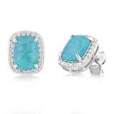 Embrace a pop of modern sophistication with our Sterling Silver Rhodium Plated Rectangle Created Turquoise Opal And White Zirconia Halo Stud Earrings. Designed to captivate, the turquoise opal sits in a striking rectangular setting, encircled by a sparkly halo of white zirconia. Crafted with attention to detail in gorgeous sterling silver and finished with a butterfly backing, these earrings offer a contemporary edge with timeless elegance.