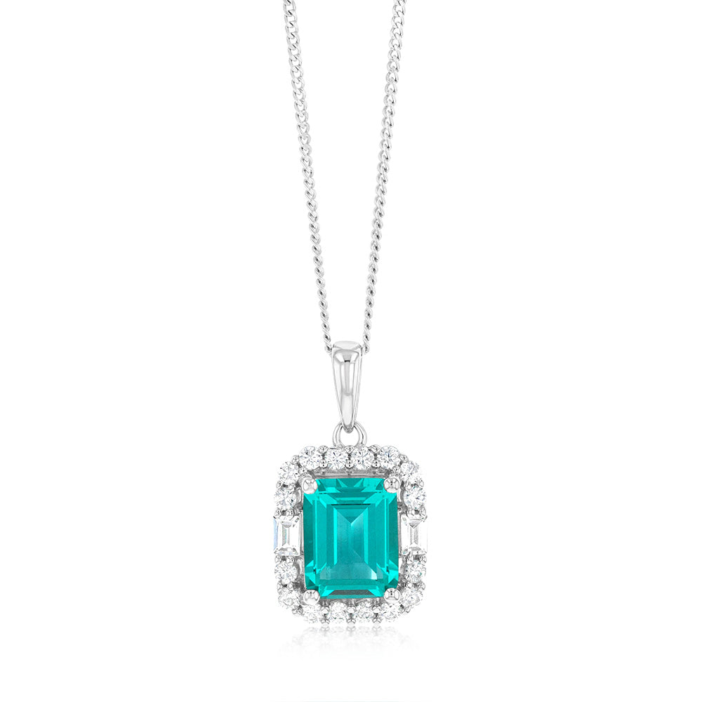 Sterling Silver Rhodium Plated White And Emerald Green Cubic Zirconia Rectangle Pendant