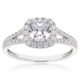 This Sterling Silver Rhodium Plated White Cubic Zirconia Cushion Ring simply beams elegance. The cushion cut zirconia is enhanced by a 4-prong setting that allows the light to enter its core. The show of brilliant lights is only intensified by a mass of cubic zirconias that encase the centre stone and then fall in duplicate on both sides of the band. The gallery has been decorated with a vintage influence, offering a classical tone to an otherwise modern design.