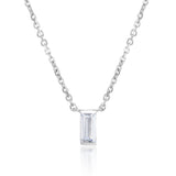 This necklace has been crafted from sterling silver and glistening in rhodium to give it an almost identical finish to what can be expected on platinum and has been set with a rectangular cubic zirconia stone that is almost identical to a diamond when seen with the naked eye. These elements provide the necklace with a luxurious look and feel at an affordable price.