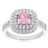 Fall in love again with this Sterling Silver Rhodium Plated White & Light Pink Cubic Zirconia Cushion Ring. Set in a three tired design, the light pink zirconia is nestled in a double wall of zirconia that fall at both sides of the band. It's a fusion of lights that gleam in perfect unison shades of soft pinks and alluring whites. The light pink stone invokes renewal and healing after a heartbreak, this soothing stone has a calming quality that opens a closed heart to the hope of new possibilities.