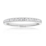 With a stunning channel setting of cubic zirconias, this sterling silver ring is sure to make a statement.